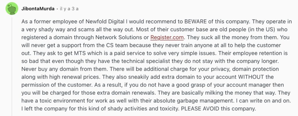 Dans ce fil Reddit, un ancien employé de Newfold Digital balance tout : pratiques douteuses, support client inexistant, facturation de services non demandés, environnement de travail toxique. Et ce n’est pas un cas isolé.